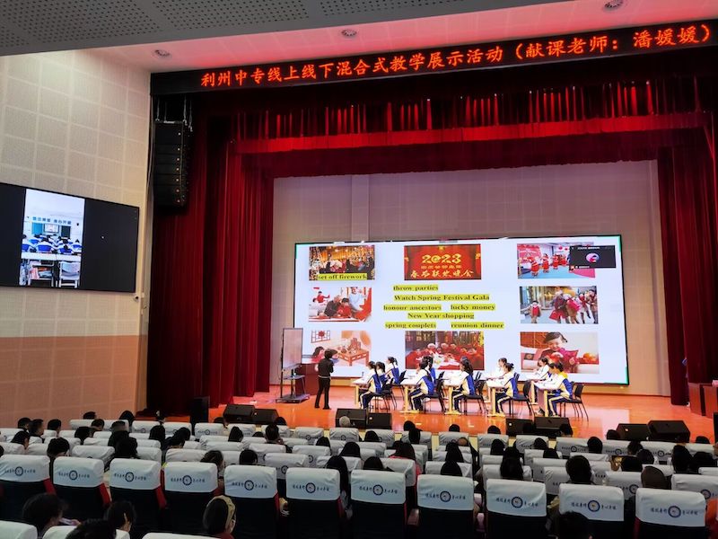 推进课堂革命,提升质量在课堂。会议以英语组教师潘媛媛执教的线上线下混合式教学展示活动《Enjoy the Festival》拉开序幕。潘老师创设教学情境、设置趣味游戏活动,寓教于乐;笑容亲切,语言幽默,润物细无声中传道解惑;教学环节环环相扣,目标明确,重点突出,展示了一堂高效、有序又不失生动有趣的课例。