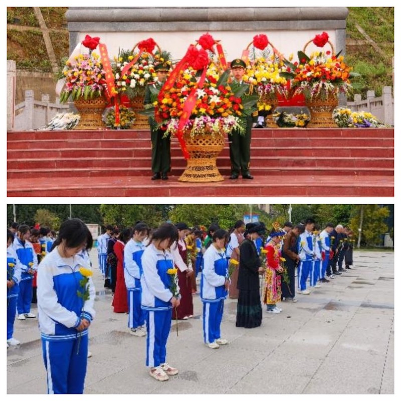 随着《献花曲》的奏响,学生向烈士墓碑敬献花篮,全体成员默哀三分钟,表达对烈士的深切悼念和哀思之情。