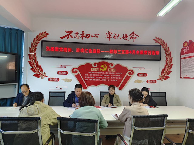 为扎实开展学习贯彻习近平新时代中国特色社会主义思想主题教育,引导党员同志弘扬伟大建党精神,铸牢信仰之魂、坚定奋斗之志,4月28日,利州中专教师三支部在教学楼东3-4会议室开展“弘扬建党精神,赓续红色血脉”主题党日活动。