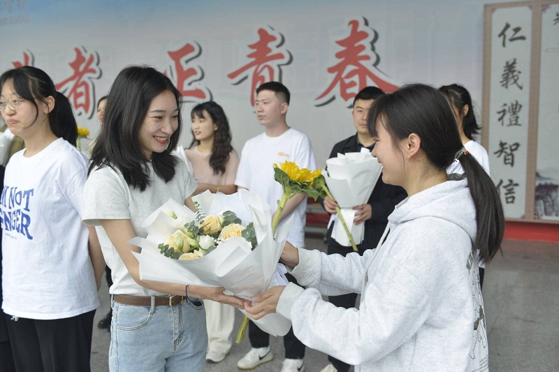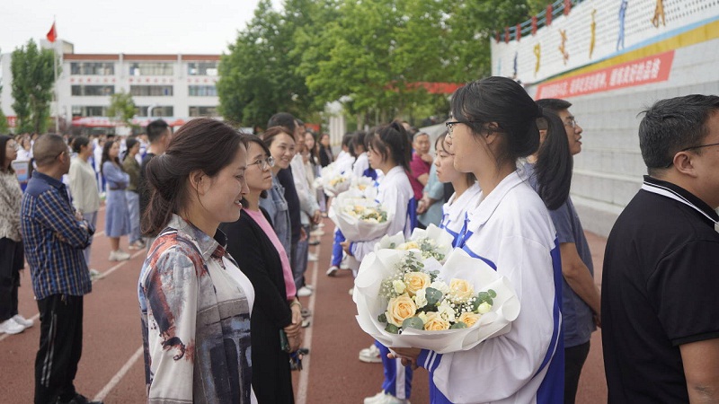 在音乐的伴奏下,2020级升学1班的同学们手捧鲜花走向班主任、任课教师,并牵握住彼此的手,走上主席台。师生相互赠送鲜花和向日葵。鲜花代表着同学们对老师辛勤付出的感谢,向日葵是老师希望同学们“一举夺魁”的美好愿望。