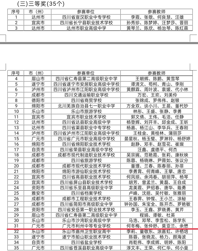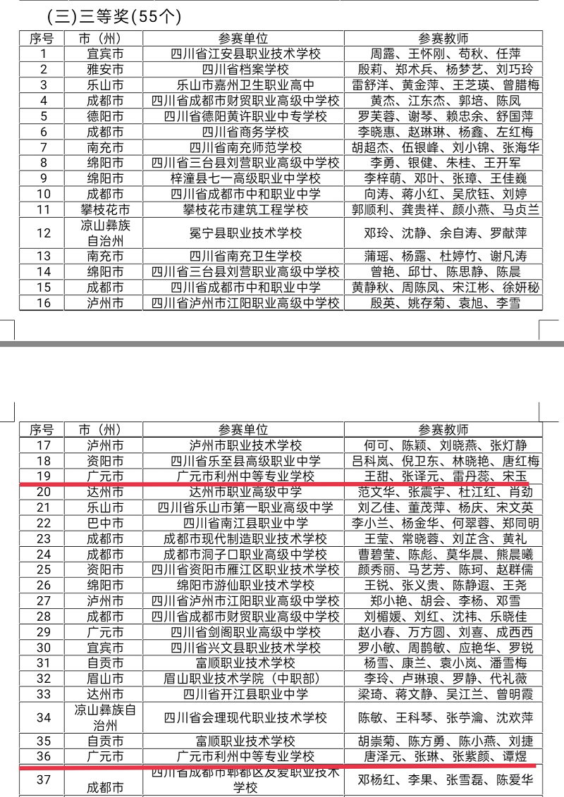 2023年7月17日,四川省教育厅公示了2023年四川省职业院校教师教学能力大赛获奖名单,利州中专5个教学团队共20位教师参与角逐,他们历经网络初选、课堂教学展示、综合素养展示的层层比赛,最终斩获一等奖2项,三等奖3项。其中一等奖分别为郑敏、王彩虹、王兴蓉、王聪组成的思政团队和程??、黄思琦、蒋艳、罗乐组成的数学团队。