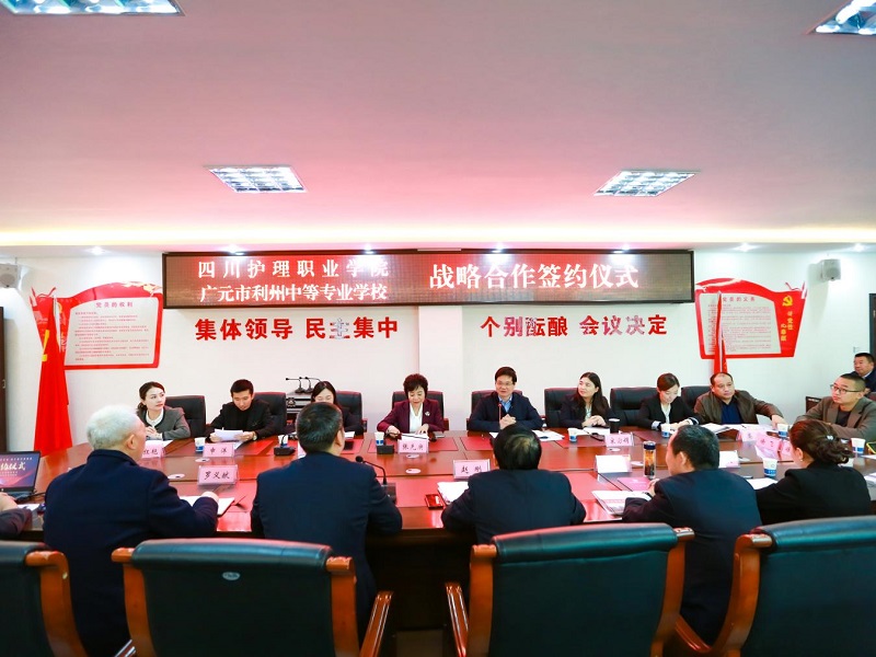 为深入学习贯彻落实党的二十大精神和习近平总书记来川、来广视察重要指示精神,推进习近平新时代中国特色社会主义思想主题教育走深走实,加快建设教育强国、教育强省,进一步加强校际之间的合作,增进两校之间的友谊,促进中高职院校协同发展,11月8日,四川护理职业学院与广元市利州中等专业学校战略合作协议签约仪式在利州中专举行。四川护理职业学院党委副书记、校长张先庚,党委委员、副校长陈劲松,党委委员、副校长梁小利,广元市利州中等专业学校在家班子成员出席签约仪式,两校相关职能部门负责人参加仪式。仪式由广元市利州中等专业学校党委副书记、校长贾相成主持。