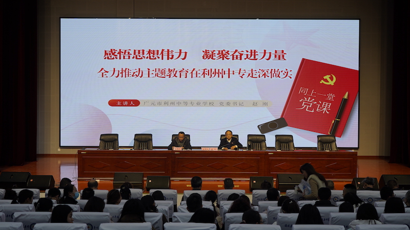 为学习贯彻习近平新时代中国特色社会主义思想主题教育,推动习近平新时代中国特色社会主义思想主题教育在利州中专扎实开展,11月29日下午,学校党委书记赵刚以《感悟思想伟力 凝聚奋进力量 全力推动主题教育在利州中专走深做实》为主题,为全体教职工讲授了一堂专题党课,市总工会二级调研员,市委主题教育第八联络组副组长王中华出席会议,党委副书记蒋超主持会议。