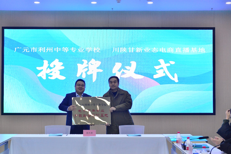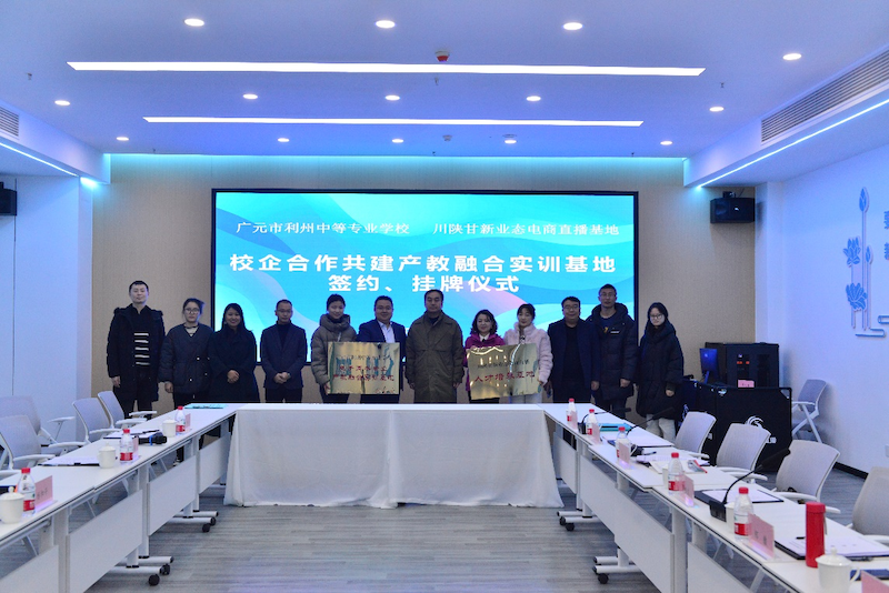 为深入落实《职业教育产教融合赋能提升行动实施方案(2023―2025年)》,打造产教融合实训基地升级版,构建产教深度融合发展新格局,增强高质量发展新动能。近年来,直播电商产业的发展逐渐壮大,对人才的需求不断增多,为了进一步促进校企合作和产教融合,有效提升青年学生专业技能,满足地方产业发展需求,12月29日上午,广元市利州中等专业学校―川陕甘新业态电商直播基地校企合作共建产教融合实训基地签约、挂牌仪式活动仪式在川陕甘新业态电商直播基地会议室举办。广元市利州中等专业学校党委副书记、校长贾相成,党委委员、工会主席郑敏和川陕甘新业态电商直播基地负责人杨和平代表双方为基地签约、授牌,仪式由实习实训科科长马灿主持。