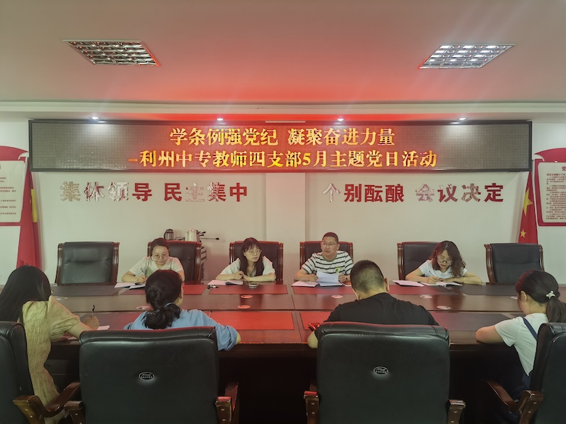 5月31日,利州中专教师四支部以“学条例强党纪 凝聚奋进力量”为主题,开展党纪学习教育第二专题学习研讨活动。活动由支部书记唐钧主持,全体党员参加活动。