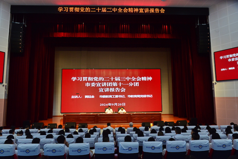 9月20日下午,学习贯彻党的二十届三中全会精神市委宣讲团宣讲报告会在利州中专举行。市委宣讲团成员、市委教育工委书记、市教育局党组书记黄廷全作宣讲报告,会议由利州中专党委书记赵刚主持。