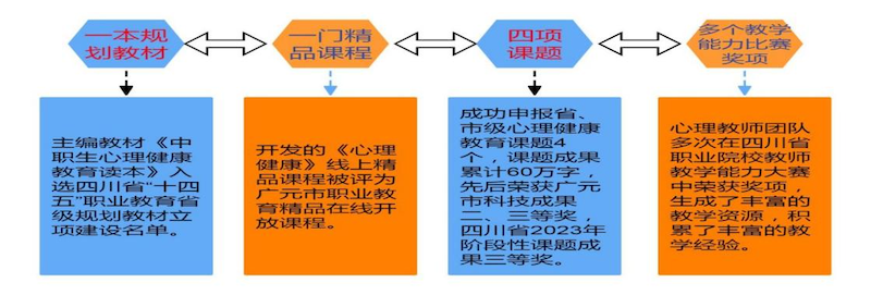 在积极探索一体化心理健康教育工作体系的历程中,学校的《德心融通,双线贯通》心理育人案例,被四川省教育厅评为德育工作典型案例;省级课题《中职学校线上线下协同式心理健康教育实践研究》成果喜获四川省2023年阶段性课题成果三等奖,并先后在省内各中职学校推广,产生了广泛而积极的影响。