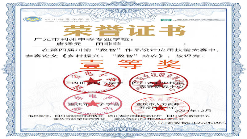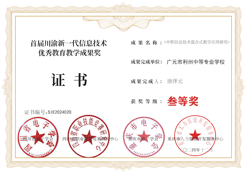 在2024年第四届川渝大学生“数智”作品设计应用技能大赛中,我校唐泽元、田菲菲老师荣获论文一等奖,唐泽元老师荣获首届川渝新一代信息技术优秀教育教学成果奖三等奖。