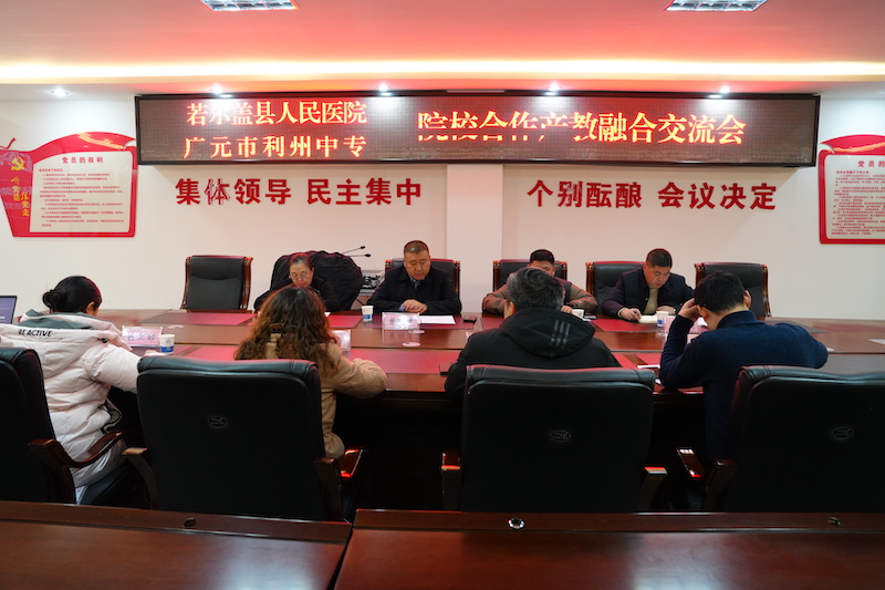 为贯彻党的二十届三中全会以及全国教育大会精神,落实教育部关于职业学校学生实习管理工作相关要求,推动学校实习工作高效、安全、优质运行,加强院校合作,共同推进民族地区卫生事业发展。12月17日下午,利州中专与若尔盖县人民医院开展产教对接会,会议在利州中专行政楼会议室举行。出席本次会议的有利州中专党委副书记、校长贾相成,若尔盖县人民医院党委书记曾明才,党委委员、副院长贾周,党委委员、工会主席何颜碧,副院长杨慧强以及学校相关科室负责人,会议由利州中专党委委员、副校长郑敏主持。