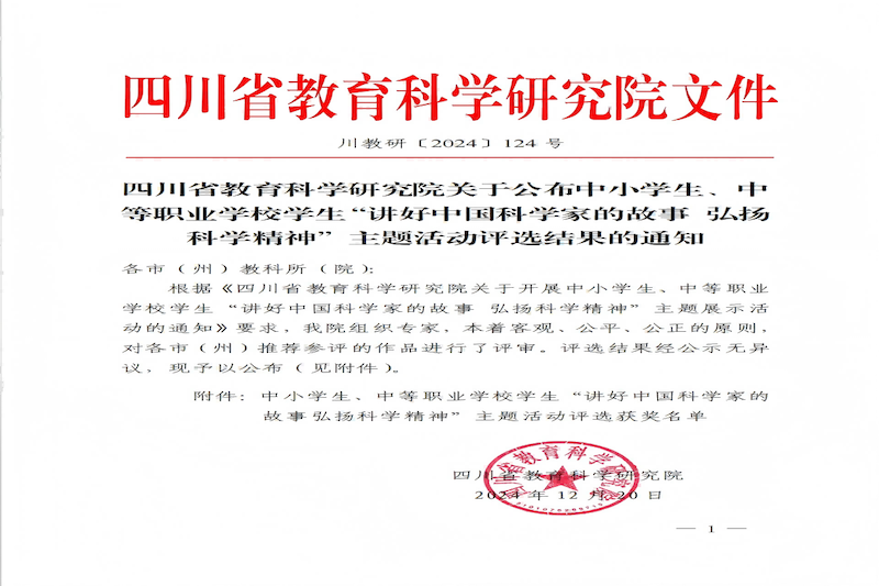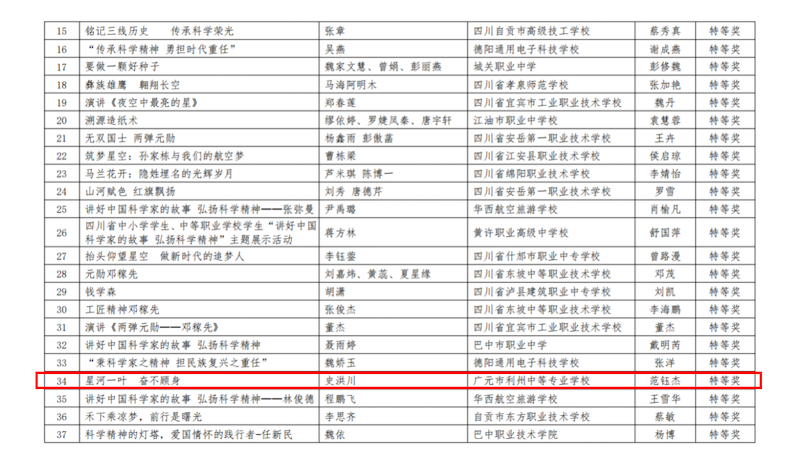 我校学生史洪川在四川省教育科学研究院举办的“讲好中国科学家的故事 弘扬科学精神”主题展示活动表现出色,荣获中职组特等奖。