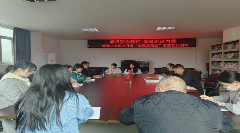 为深入学习贯彻习近平总书记在全国两会期间的重要讲话精神和全国两会精神,3月28日,教师三支部在学校工会活动室开展“红色星期五”主题党日活动,支部全体党员参加会议,支部书记唐家鹏主持会议。