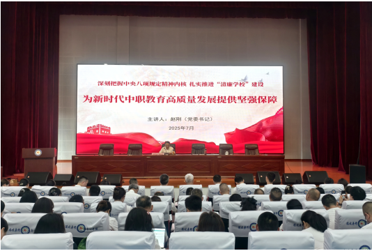 党委书记赵刚以《深刻把握中央八项规定精神内核 扎实推进“清廉学校”建设,为新时代中职教育高质量发展提供坚强保障》为题讲深入贯彻中央八项规定精神学习教育专题党课。他强调要深刻领悟习近平总书记关于加强党的作风建设的重要论述,将其与中央八项规定及其实施细则精神紧密结合。要在全面学习、全面把握、全面落实上下功夫,坚持读原著、学原文、悟原理,联系实际,务求实效,将理论学习成果切实转化为推动工作的强大动力。