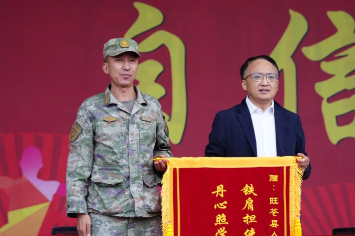 大会尾声,学校党委书记赵刚代表学校,向旺苍县人民武装部赠送绣有“铁肩担使命军训育栋梁,丹心照学子桃李满庭芳”的锦旗。